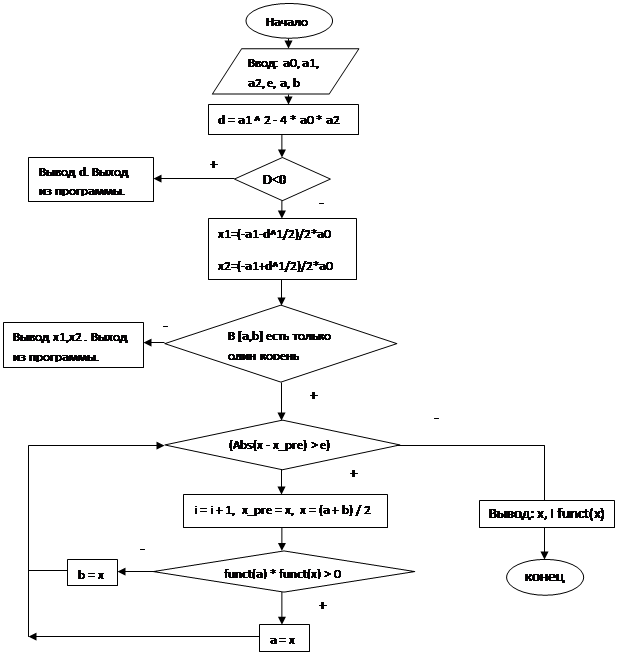 Вычислительный процесс базируется на следующем подходе. Проверяем есть ли у заданного уравнения действительные корни по формуле: D=a1^2-a0*a2. Если D<0, значит действительных корней нет и решить такую систему у нас не получится. Если действительные корни есть, то найдем их методом решения квадратных уравнений через дискриминант. Проверим единственность корня на заданном отрезке [a,b]. Если на этом отрезке существует не один корень или вообще не существует корней, то надо задать другой отрезок. Затем делим отрезок пополам и проверяем на какой его половине лежит корень. Для этого значение функции должна быть разного знака на концах отрезка. Полученный отрезок мы опять делим пополам. Этот итерационный процесс мы продолжаем до тех пор пока модуль разности между точкой, полученной на i-й итерации и точкой, полученной на (i-1) итерации не будет меньше заданной точности. Это и будет корнем уравнения.