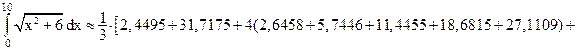 Разобьём интервал (–1; 9) на n = 10 отрезков (h =1) и вычислим значения подынтегрального выражения для начала и конца каждого отрезка.