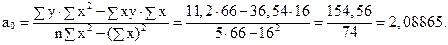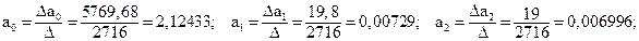Коэффициенты а0 , а1 , а2 квадратичной зависимости найдём, также выполнив необходимые расчёты в таблице: