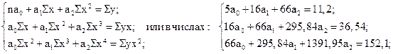 Т.о. квадратичная зависимость у = а0 + а1 х + а2 х2 имеет вид: