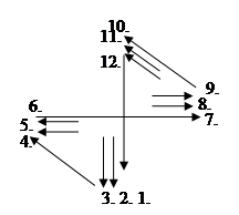 Е) Двенадцатидольные размеры дирижируются двенадцатью взмахами. В основе приема лежит четырехдольная фигура взмахов. Каждое направление движения соответствует простому такту. Каждый взмах этой фигуры устроен: