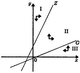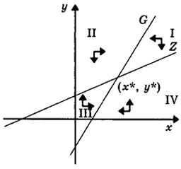полуплоскости dx/dt > 0, а другой полуплоскости dx/dt < 0. То есть первое уравнение системы (3) как бы заставляет точки притягиваться по горизонтали к прямой G . Аналогичное утверждение верно для второго уравнения этой системы и прямой Z (вертикальное притяжение) (рис.2). Прямые G и Z делят первый квадрант на четыре области, обозначенные римскими цифрами I, II, III, IV.