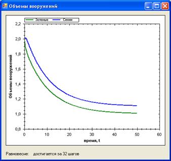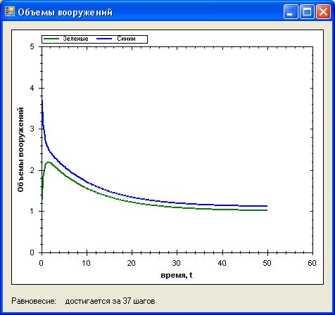 Как видно из графика – за 41 шаг достигается точка равновесия. Это объясняется тем, что в начальный момент времени значение объема вооружения первого государства значительно больше вооружения второго. Затем, пока объем вооружения зеленых снижается, сини наращивают объем, это продолжается до тех пор, пока объемы не совпадут. Затем наблюдается одновременный спад и установление стабильного режима через 41 шаг (установление стабильного режима определятся с погрешностью 0.0001).
