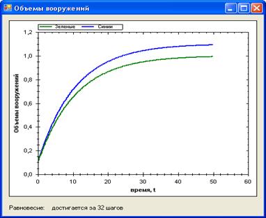 Здесь ситуация аналогична предыдущему случаю – из-за того, что начальные условия близки, в начале возникает одновременный рост объема вооружений, а спустя 32 шага – устанавливается равновесное состояние.