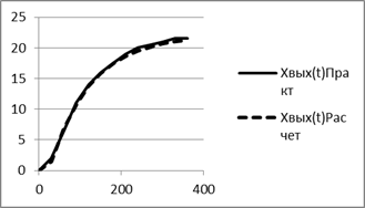 По уравнению (16) и проводится проверка точности совпадения расчётной кривой разгона с экспериментальной, т.е. проверка адекватности математической модели объекта. В уравнении (16) p1 и p2 – корни характеристического уравнения объекта по рассматриваемому каналу, получаемого приравниванием знаменателя передаточной функции (14) к нулю, т.е. корни уравнения вида: