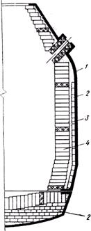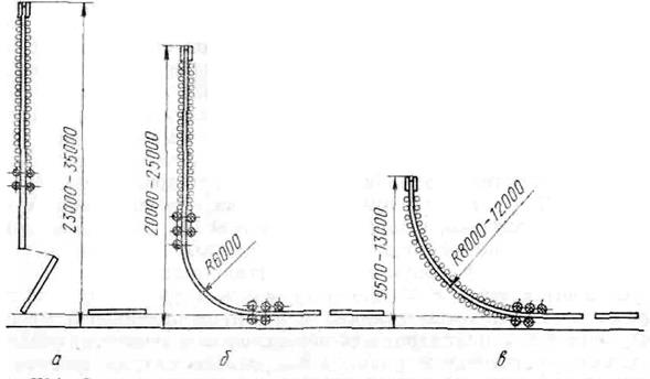 Начало промышленного применения непрерывного литья положили машины вертикального типа, у которых кристаллизатор, роликовая проводка, тянущее и режущее устройства расположены по вертикали на высоту 23—35 м, а в ряде случаев и до 43 м. Машины вертикального типа позволяют получать слитки высокого качества, однако их широкому использованию препятствуют присущие им крупные недостатки — большая высота и низкая скорость литья- С целью уменьшения высоты здания и возможности подачи сталеразливочных ковшей к рабочей площадке вертикальные МНЛЗ выполняют с расположением концевой части машины в железобетонном колодце. Помимо удорожания строительства, это приводит к необходимости применения сложных систем выдачи заготовок из колодца. Повышение скорости литья путем увеличения длины зоны кристаллизации слитка на вертикальных машинах не может быть реализовано, так как с увеличением высоты возникает большое ферростатическое давление, приводящее к выпучиванию корки слитка и ее разрушению с прорывом наружу жидкой фазы.