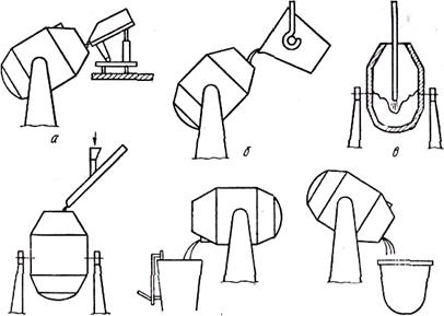 Плавку начинают с загрузки в конвертор лома. Загрузку ведут через горловину завалочными машинами или кранами, которые опрокидывают лотки с ломом в наклоненный конвертор. Затем из заливочного ковша с помощью мостового крана через горловину наклоненного конвертора заливают жидкий чугун (рис. 11, б).