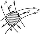 Линии скольжения покрывают область ортогональной сеткой. Бесконечно малый элемент, выделенный линиями скольжения, испытывает одинаковое растяжение в направлениях линий скольжения (рис. 3).