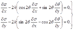 К приведенным уравнениям следует присоединить соотношения, связывающие компоненты напряжения с приращениями компонент деформации; это будут соотношения (7), в которых нужно отбросить слагаемые, относящиеся к упругой деформации, т. е. соотношения теории пластичности Сен-Венана-Мизеса (12). В случае плоской деформации остаются лишь три соотношения (для