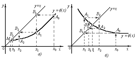 Возможен также другой вид ломаной А 0 В 1 А 1 В 2 А 2 ... - “спираль” (Рисунок 6, б ). Решение в виде “лестницы” получается, если производная j' (х ) положительна, а решение в виде “спирали”, если j' (х ) отрицательна.