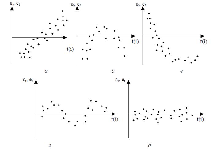Естественно предположить, что на рис 2.1. а-г имеются определенные связи между отклонениями, т.е. автокорреляция имеет место. Отсутствие зависимости на рис. д скорее всего свидетельствует об отсутствии автокорреляции.