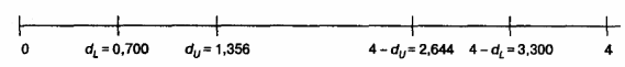 Зададим уровень значимости a = 0,05. По таблицам значений критерия Дарбина–Уотсона определим для числа наблюдений n = 7 и числа независимых переменных модели k ' = 1 критические d L = 0,700 и d U = 1,356. Получим следующие промежутки внутри интервала [0;4]