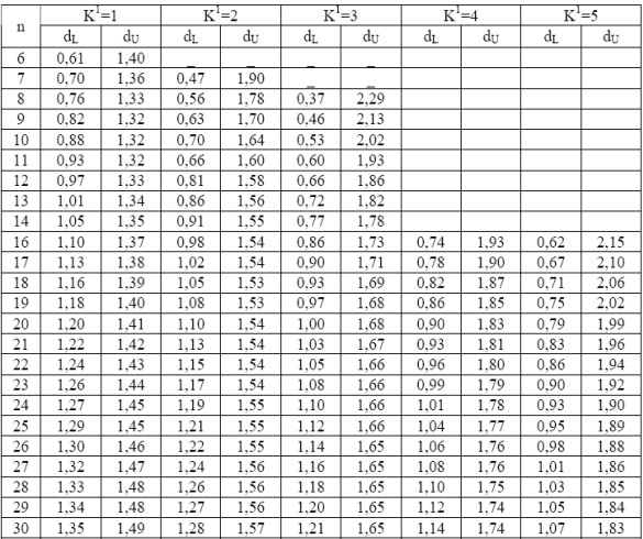 состоят, соответственно, в наличии положительной или отрицательной автокорреляции в остатках. Далее по таблице (приложение А) определяются критические значения критерия Дарбина–Уотсона