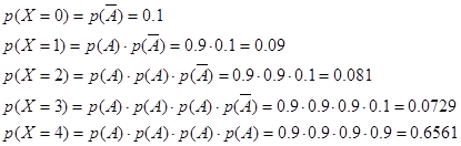 | р | 0,1 | 0,09 | 0,081 | 0,0729 | 0,6561 |