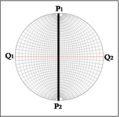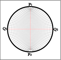 Сетка Вульфа или стереографическая сетка представляет собой проекцию меридианов и параллелей сферической поверхности на плоскость одного из меридианов, называемого в этом случае ОСНОВНЫМ. Центром проекции является точка ЭКВАТОРА сферы, удаленная от основного меридиана на (