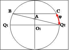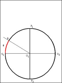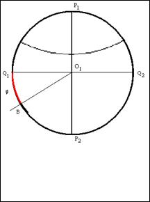 · другой стороной угла является луч, проходящий через точку пересечения экватора окружности с линией окружности (точка