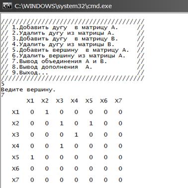 Рисунок B7–Вывод выполнение операции удаление и добавление вершины матрицы.