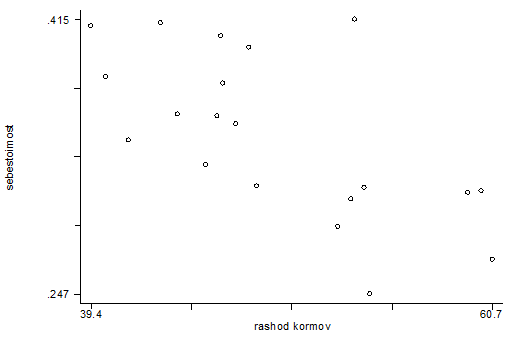 Из выше приведенного можно сказать о сильной обратной связи между удоем молока и себестоимостью, т.е. при увеличении удоя себестоимость молока снижается.