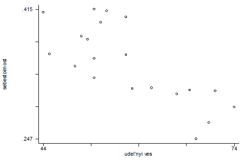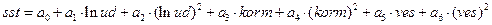 . Это уравнение значимо согласно F-критерию Фишера, и параметр при переменной lnud и константа значимы по t-критерию Стьюдента. 63,78 % суммы квадратов отклонений переменной sst от среднего значения объясняется переменными модели. А при увеличении удоя молока на 2,72 % себестоимость снижается на 0,17 %.