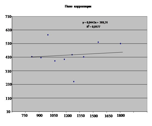 1. Построим поле корреляции (на отдельном листе) и сформулируем гипотезу о форме связи, предполагая, что генеральное уравнение регрессии – линейное: ![]()