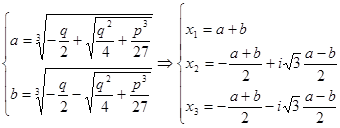 Поскольку уравнение в третей степени, то соответственно решениями этого уравнения будут три корня, которые сейчас определим из следующей системы