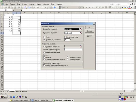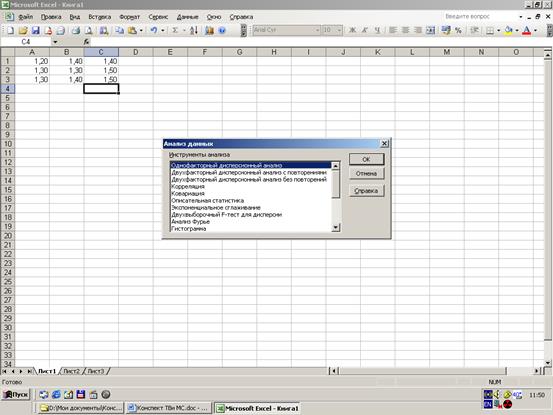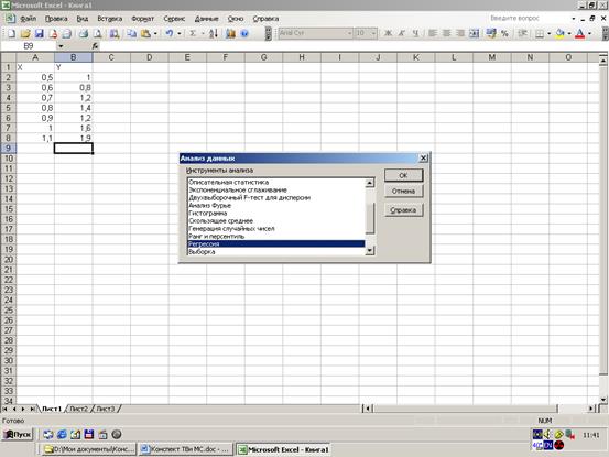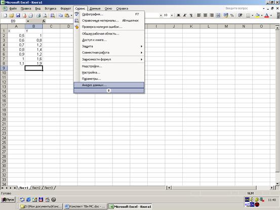 Табличный процессор Excel так же позволяет проводит автоматизированный корреляционно- регрессионный анализ. Для этого в опции Сервис находим пакет анализа данных (см. рис.)