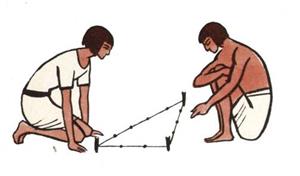 Для построения прямого угла использовался шнур или верёвка, разделённая отметками (узлами) на 12 (3+4+5) частей: треугольник, построенный натяжением такого шнура, с весьма высокой точностью оказывался прямоугольным и сами шнуры-катеты являлись направляющими для кладки прямого угла сооружения.