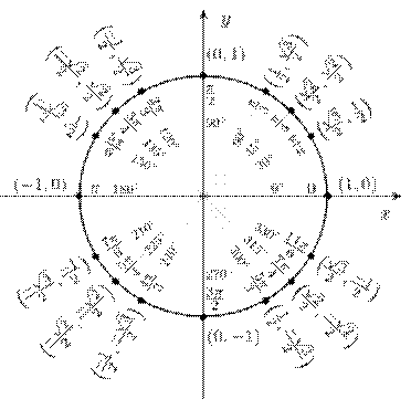 | 0°(0 рад) | 30° (π/6) | 45° (π/4) | 60° (π/3) | 90° (π/2) | 180° (π) | 270° (3π/2) | 360° (2π) | |