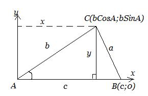 Введем систему координат с началом в точке А. Точка В имеет координаты (с; 0), а точка С(bcosA; bsinA). По формуле расстояния между двумя точками d2 = (x2 – x1)2 + (y2 – y1)2получаем: