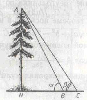 Если основание предмета недоступно, то можно поступить так: на прямой, проходящей через основание Н предмета, отметим две точки В и С на определенном расстоянии а друг от друга и измерим углы АВН и АСВ: ∟АВН =a, ∟АСВ = b, ∟ВАС = a –b.Эти данные позволяют определить все элементы треугольника АВС; по теореме синусов находим АВ: АВ = asinb/ sin (a –b). Из прямоугольного треугольника АВН находим высоту АН предмета: