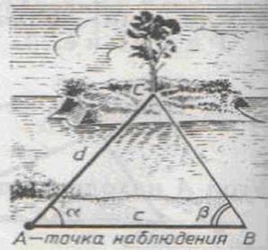 На местности выберем точку В и измерим длину с отрезка АВ. Затем измерим, например с помощью астролябии, углы А и В: ∟А= a и ∟В = b. Эти данные, т.е. с , a и b, позволяют решить ∆АВС и найти искомое расстояние d=AC.