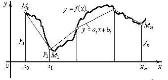 Простейшим и часто используемым видом локальной интерполяции является линейная ( или кусочно-линейная) интерполяция. Она состоит в том, что заданные точки ( х i , у i ) ( i=0, 1, …, n ) соединяются прямолинейными отрезками, и функция f(х) приближается ломаной с вершинами в данных точках.