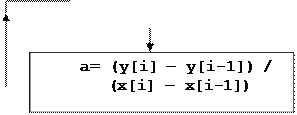 a:= (y[i] – y[i-1]) / (x[i] – x[i-1]);