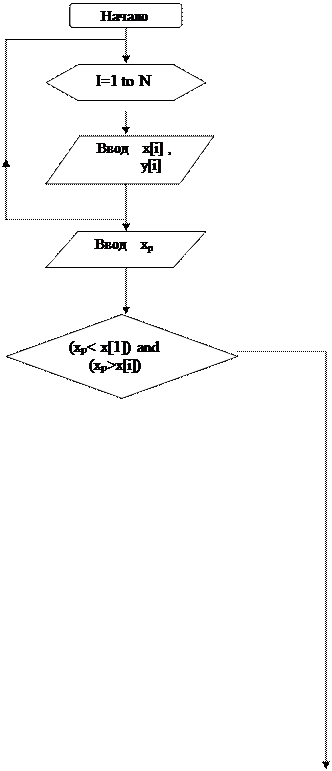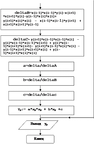 Алгоритм нахождения приближенного значения функции с помощью квадратичной интерполяции можно записать в виде структурограммы, как и для случая линейной интерполяции. Вместо формулы (1) нужно использовать (2) с учетом решения системы линейных уравнений (3). Интерполяция для любой точки x є [xo , xn ] приводится по трем ближайшим к ней узлам.
