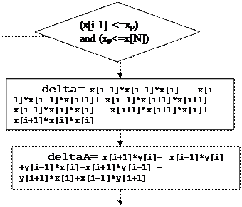 deltaA:= x[i+1]*y[i]– x[i-1]*y[i] +y[i-1]*x[i]-x[i+1]*y[i-1] – y[i+1]*x[i]+x[i-1]*y[i+1];