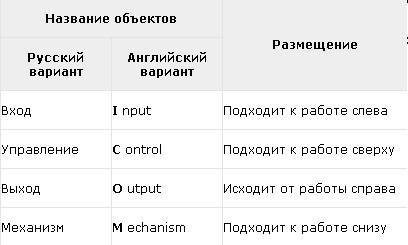 Четыре типа объектов, применяемых для описания входов и выходов в стандарте IDEF0, в английском варианте образуют сокращение ICOM и на схеме IDEF0 размещаются в строго отведенных местах относительно работ, которые называются функциональными блоками (Таблица 1).