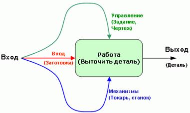 Давайте рассмотрим пример бизнес-процесса "Выточить деталь", который выполняет токарь. Входом процесса является заготовка из которой вытачивается деталь – она физически преобразуется в процессе. Для того, что бы токарь начал точить деталь ему нужно дать задание или план. Также ему понадобится чертеж с размерами детали. Так вот, чертеж, задание или план нужны для реализации бизнес-процесса и процесс без них не начнется, но по ходу выполнения процесса они не преобразуются. Согласно стандарту IDEF0 их относят к управлению. Для того, что бы выточить деталь нужен токарь, нужен станок – их относят к механизмам. Выходами или результатами бизнес-процесса является деталь (рис. 3).