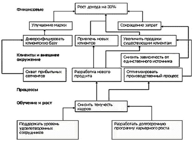 Между показателями и целями всех четырех проекций существует причинно-следственная связь. Например, увеличение прибыли от реализации продукции может быть обеспечено за счет повышения лояльности клиентов и привлечения новых клиентов, что в свою очередь связано с усилением работы с клиентами вследствие повышения качества услуг, что опять-таки определяется ростом квалификации персонала. Причинно-следственные отношения вытекают из стратегии компании и учитывают временной фактор в принятии решений и пропорциональную зависимость между параметрами.