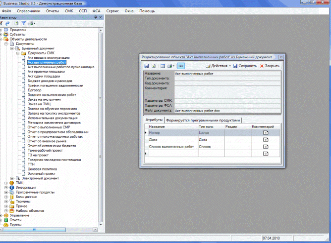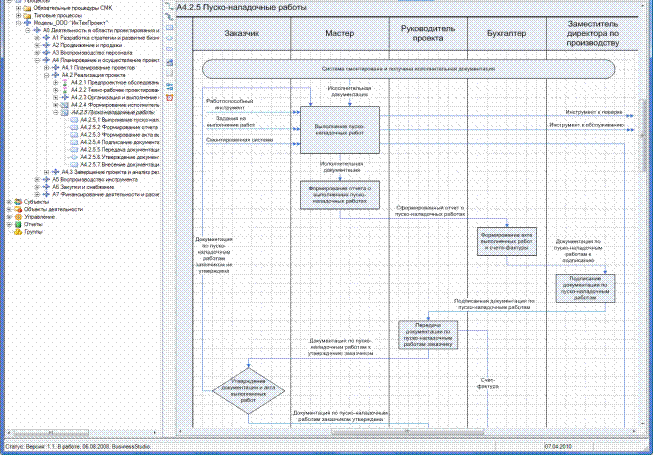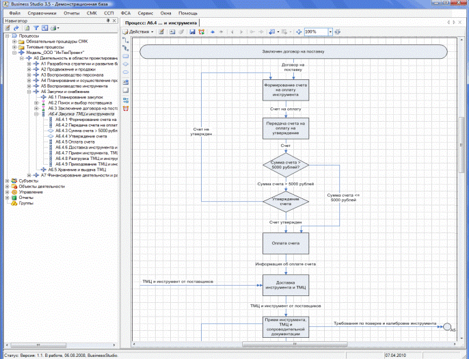 Сочетание наглядных графических нотаций и параметров процессов обеспечивает максимально комфортную работу бизнес-аналитика от начала проектирования до выпуска регламентирующей документации. В рамках описываемых процессов, непосредственно на диаграммах или в свойствах элементов диаграмм, задаются операции с различными объектами деятельности (например, документами), а также их атрибутами (например, реквизитами документа).