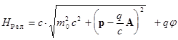 на его релятивистский аналог, вид которого устанавливался на основании сравнения классических (не квантово-механических) выражений для релятивистской и нерелятивистской функций Гамильтона: