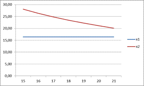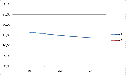Построим модель поведения потребителя в зависимости от изменения цен. Цены варьируются в диапазоне от: цена на первое благо изменяется от 20 до 24 единиц, а на второе от 15 до 21. Доход остается неизменным и равным 750 единиц. А коэффициенты предпочтительности благ равны 0,35 и 0,45 соответственно.