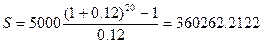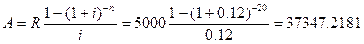 Вывод : Величина фонда накопления по истечении 20 лет составит – 360262,2122$. Сумма в размере 37347,2181 $ размещенная под 12% годовых обеспечит ежегодную выплату по 5000$ в течение 20 лет.