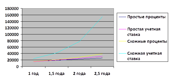 Из графика ясно, что наиболее выгодным для кредитора является вариант сложной учетной ставки. Затем идут сложные проценты, простая учетная ставка и наименее выгодными являются простые проценты.