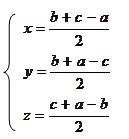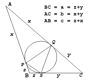 Пусть окружность касается сторон АВ, ВС и АС соответственно в точках P, S и Q. Обозначим отрезки AP, CQ и BS как x, y и z соответственно. Тогда из «отрезки касательных, проведенных из одной точки равны», следует, что AC = AQ = x, CQ = CS = y, BS = BP = z.