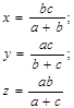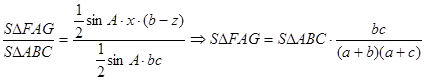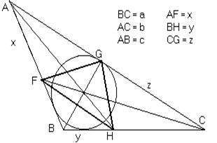 Обозначим AF = x, BH = y, CG = z. По свойству биссектрис («биссектриса делит сторону треугольника на отрезки, пропорциональные двум другим сторонам»), тогда ![]()