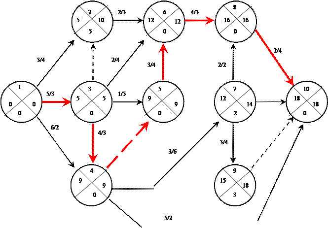 Критический путь в СГ проходит через события и работы, необладающие резервами времени, и имеет, следовательно, максимальную продолжительность, равную сроку свершения завершающего события.