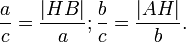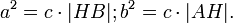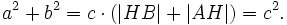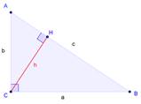 Пусть ABC есть прямоугольный треугольник с прямым углом C. Проведём высоту из C и обозначим её основание через H. Треугольник ACH подобен треугольнику ABC по двум углам. Аналогично, треугольник CBH подобен ABC. Введя обозначения: