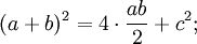 3. Площадь всей фигуры равна, с одной стороны, площади квадрата со стороной (a+b), а с другой стороны, сумме площадей четырёх треугольников и площади внутреннего квадрата.