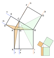 Докажем теперь, что площадь треугольника ACK также равна половине площади квадрата DECA. Единственное, что необходимо для этого сделать, — это доказать равенство треугольников ACK и BDA (так как площадь треугольника BDA равна половине площади квадрата по указанному выше свойству). Равенство это очевидно, треугольники равны по двум сторонам и углу между ними. Именно — AB=AK,AD=AC — равенство углов CAK и BAD легко доказать методом движения: повернём треугольник CAK на 90° против часовой стрелки, тогда очевидно, что соответствующие стороны двух рассматриваемых треугольников совпадут (ввиду того, что угол при вершине квадрата — 90°).