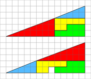 Действительно, общая площадь четырёх частей (жёлтой, красной, синей и зелёной) равна 32 кв. ед., а площадь треугольника 13×5 равна 32,5 кв. ед. Отношение длин катетов синего треугольника 5:2, а красного — 8:3, поэтому эти треугольники не являются подобными, а значит, имеют разные углы. Гипотенузы в обоих треугольниках 13×5 на самом деле являются ломаными линиями. Если наложить треугольники 13×5 друг на друга, то между их гипотенузами образуется параллелограмм, в котором и содержится "лишняя" площадь.